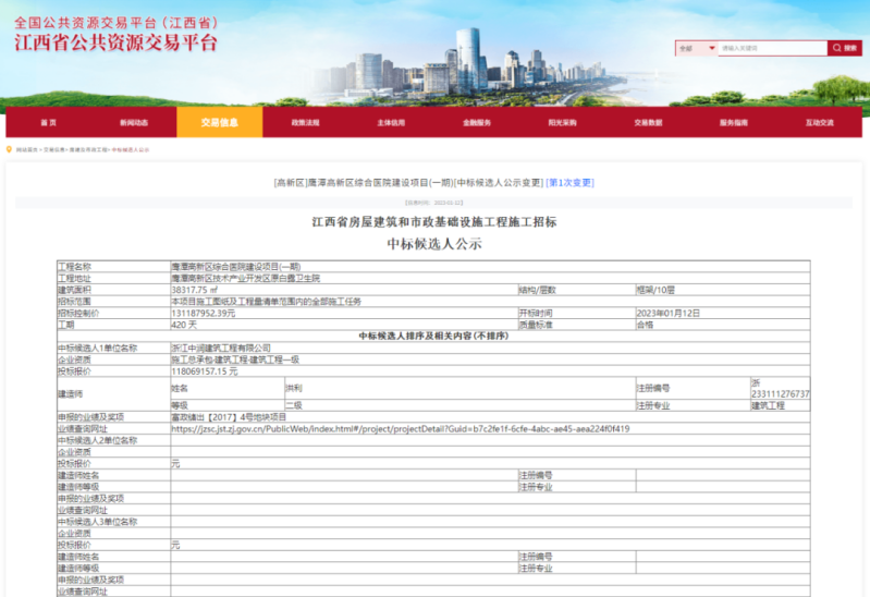 鹰潭高新区综合医院建设项目(一期)项目中标公示图