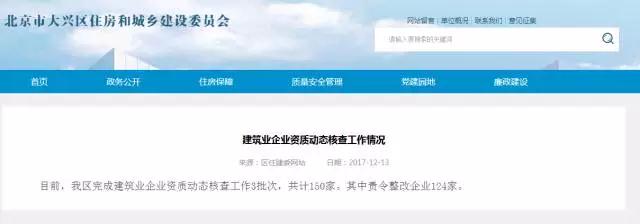 随着建筑业企业资质动态核查步入行业常态化。近日,北京市大兴区对所区辖资质管理150家企业进入全面效能核查。其中124家建企被责令整改!