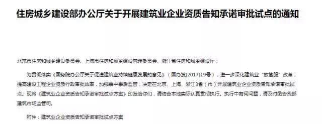 联系到近日,住房和城乡建设部颁布《关于开展建筑业企业资质告知承诺审批试点的通知》,明确要求: