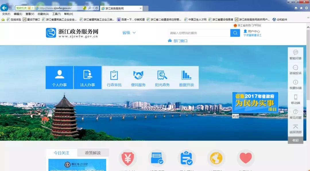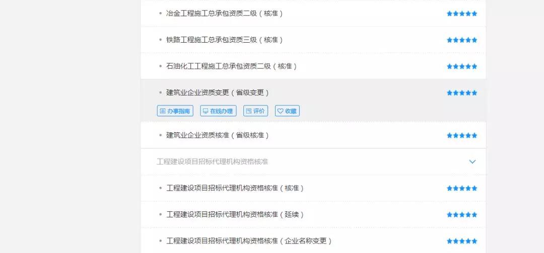 1、按照资质申请操作步骤,点击“法人办事——按部门——省建设厅”进入下图界面,选择建筑业企业资质变更(省级变更)事项,点击“在线办理”按钮,进入企业网上“操作流程”。(图示如下)