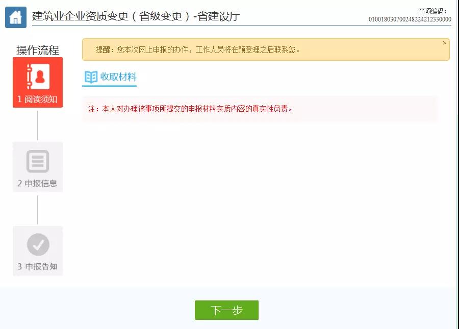 2、上一步操作后,网页将自动跳转进入企业“操作流程—1阅读须知”界面,企业在阅知“收取材料”提示后,点击“下一步”按键,进入“操作流程—2申报信息”环节。由于建筑业企业资质变更事项已采用智能化审批,不需要企业提交其余材料,该步骤直接点击“下一步”即可。(图示如下)