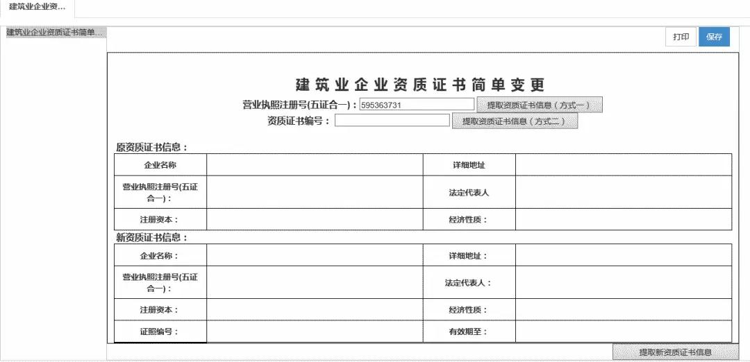 4、点击在线填表页面将跳转至“建筑业企业资质证书简单变更”,在表格内点击“提取资质证书信息(方式一或二,建议使用方法一)”,进行原资质证书信息的提取(一般情况下建议采用方式一)。提取完成后,点击表格右下方“提取新资质证书信息”,完成新资质证书信息的提取。确认企业相关信息,点击页面右上方的“保存”和“提交”。(图示如下)