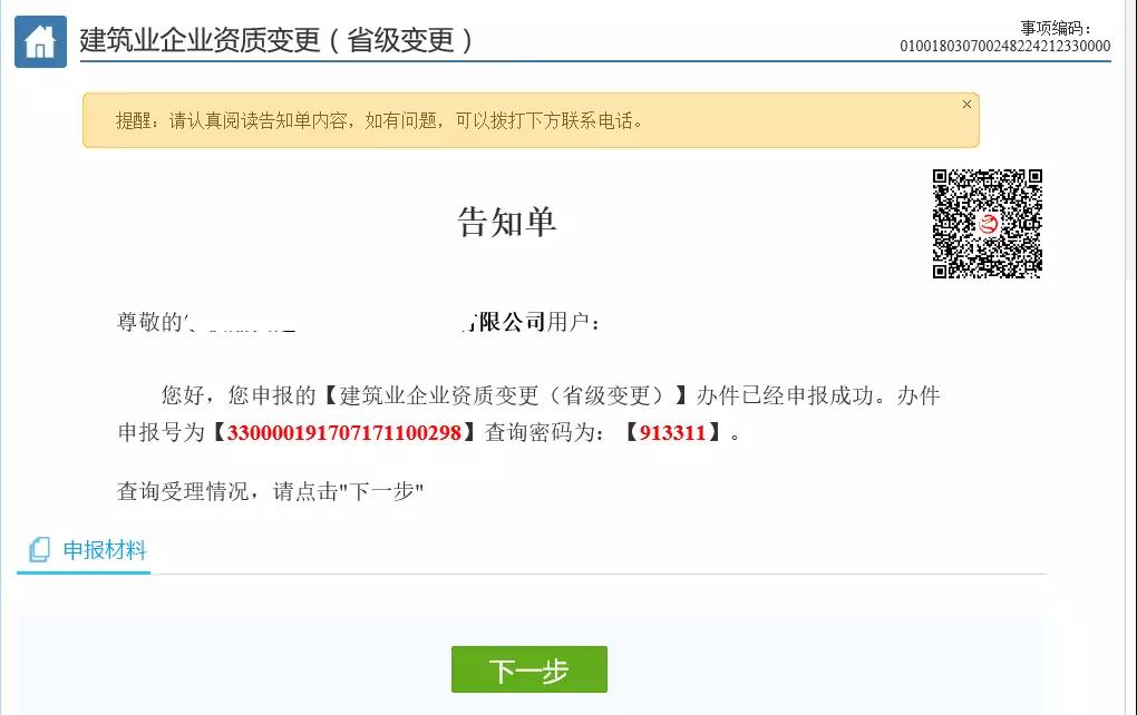 6、上续操作后,网页将自动跳转进入企业“告知单”界面,请企业记录《告知单》中的“办件申报号”和“查询密码”,以便在本系统“办事进度”中进行查询。(图示如下)