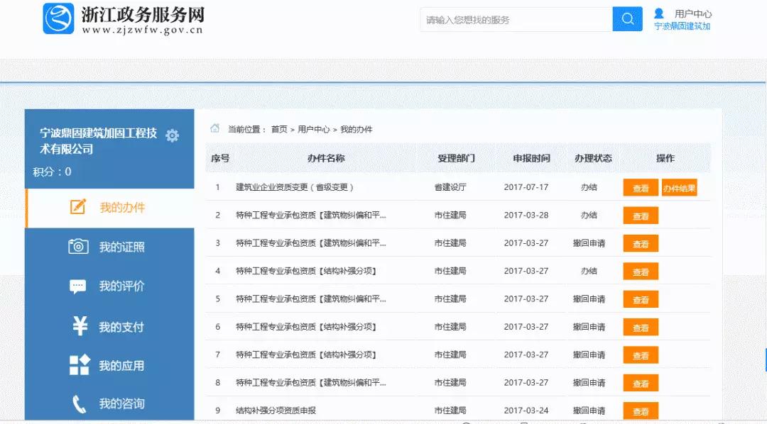 2、点击左边我的办件找到当即申报办件,点击右边“办件结果”。(如图所示)