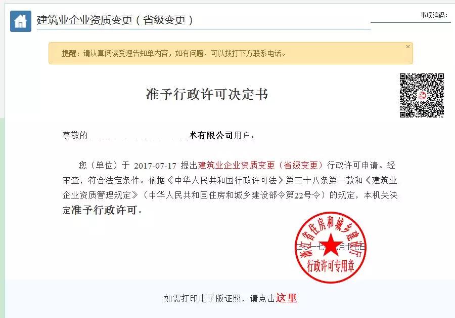 页面跳转至“准予行政许可决定书”,点击下方“这里”打印证书。(如图所示)
