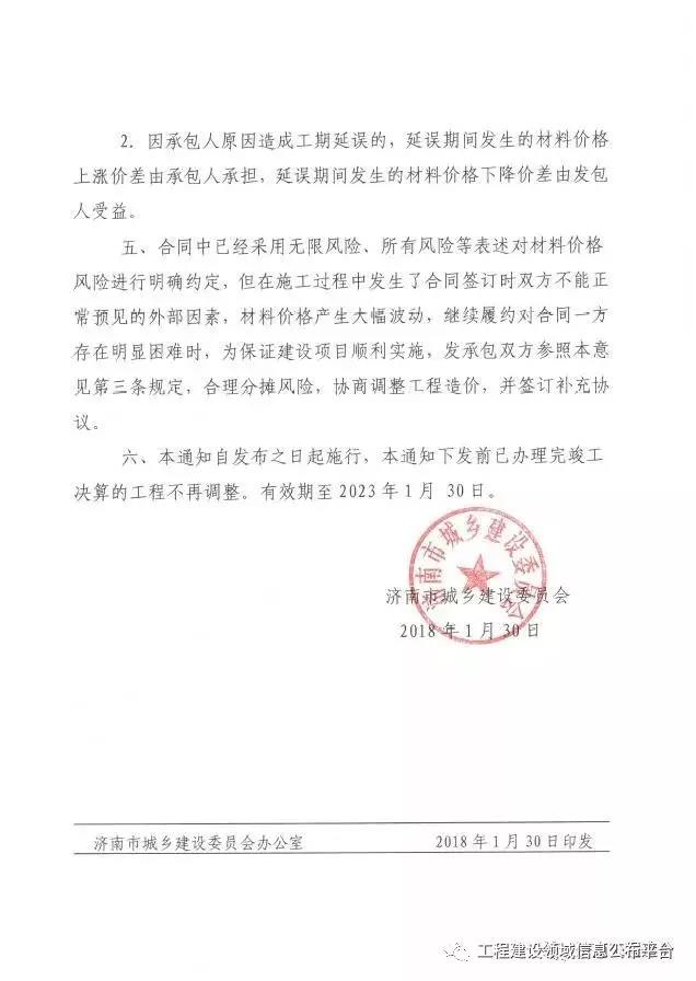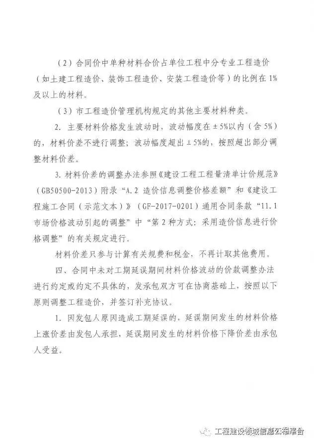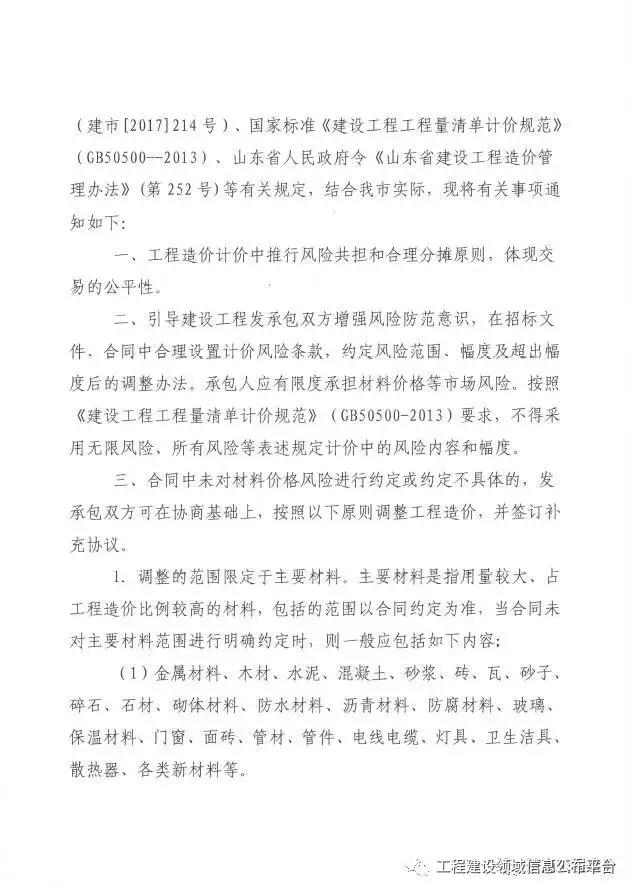 吉林省发文明确承包人采购材料和工程设备,合同中对材料和工程设备价格未明确风险范围和超出风险范围未明确调整办法的,其主要材料和工程设备,价差在5%以内(含5%)的,由施工单位承担;超过5%以上部分的价差,由建设单位承担。济南市发文明确工程计价中应推行风险共担和合理分摊原则,承包人应有限度承担材料价格等市场风险诸多亮点。