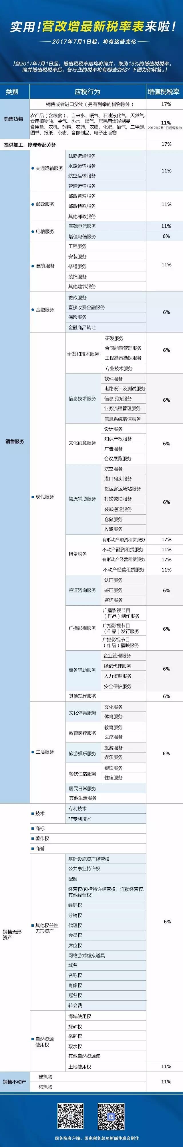 近日国家税务总局公布了营改增最新税率表,详细列举了各行业适用的税率。