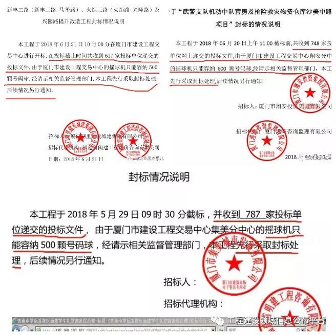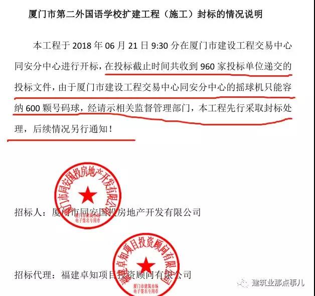 “厦门市第二外国语学校扩建工程(施工)”项目,原本6月21日9点30分开标,但投标人数达到了惊人的960家,厦门工程交易中心同安分中心的摇号机只有600颗号码球,无法摇号,只能被迫封标处理。