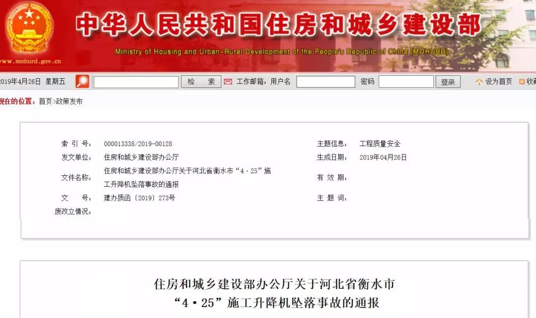2019年4月26日住建部官网发布《住房和城乡建设部办公厅关于河北省衡水市“4·25”施工升降机坠落事故的通报》,通报明确提出: