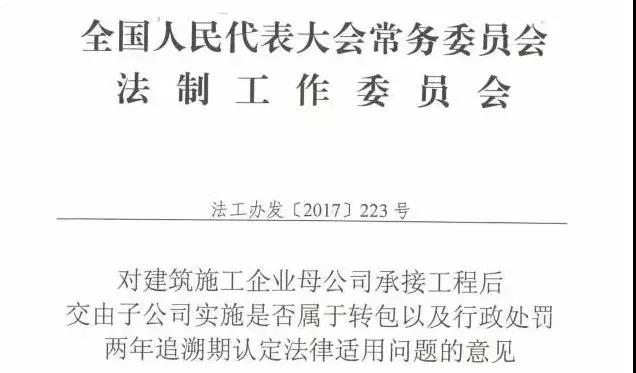 2017年,住建部曾向全国人大法工委发出请示函,全国人大法工委作出《对建筑施工企业母公司承接工程后交由子公司实施是否属于转包以及行政处罚两年追溯期认定法律适用问题的意见》(法工办发[2017]223号,以下简称《意见》)认为: