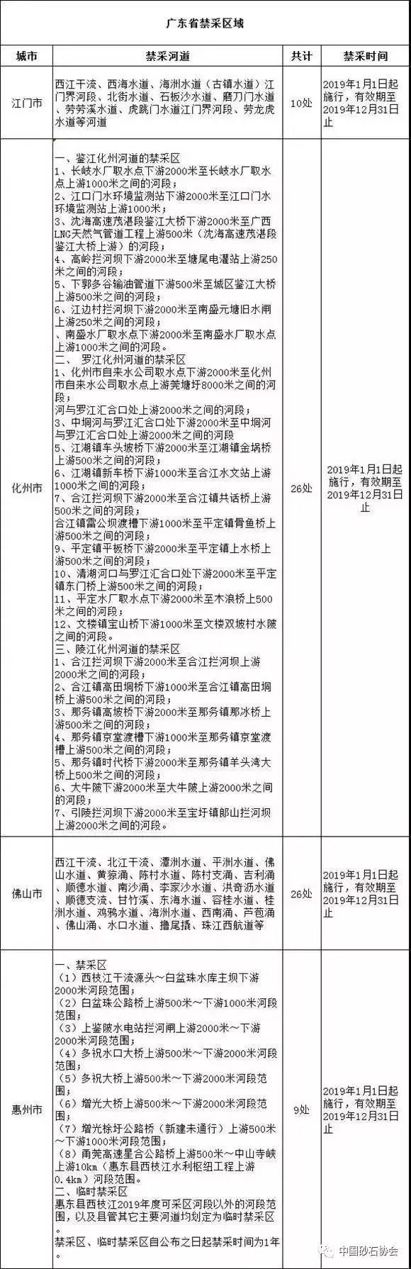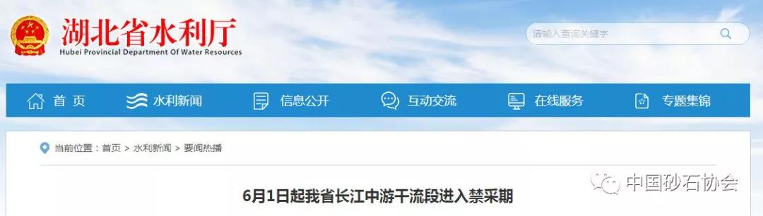 6月1日起,湖北省长江中游干流段进入禁采期,根据2019年湖北省政府发布的《关于加强河道采砂管理禁采的通告》,禁采为期4个月,至9月30日止,相应河道水位超警戒水位时,也要禁采。