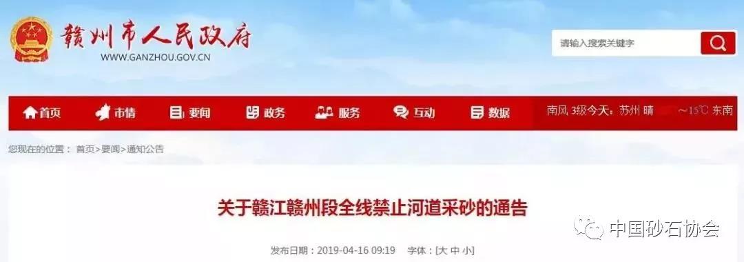 4月16日,江西赣州市人民政府发布《关于赣江赣州段全线禁止河道采砂的通告》,要求赣江赣州自5月1日起全线停止采砂。禁采区范围内严禁任何单位和个人从事任何形式的河道采砂活动。