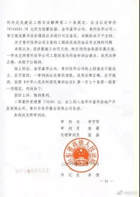 2016年12月17日,山东省高院民事判决书显示,这场官司的结果是维持原判,原告浙江博元胜诉,被告金华嘉华和青州佳华向原告支付包含利息在内的工程款约3500万元,并驳回了青州佳华提出的浙江博元工期延误的主张。陆晓东说,没想到的是赢了官司,他们反而收到了一张要求支付工程款的执行通知书。