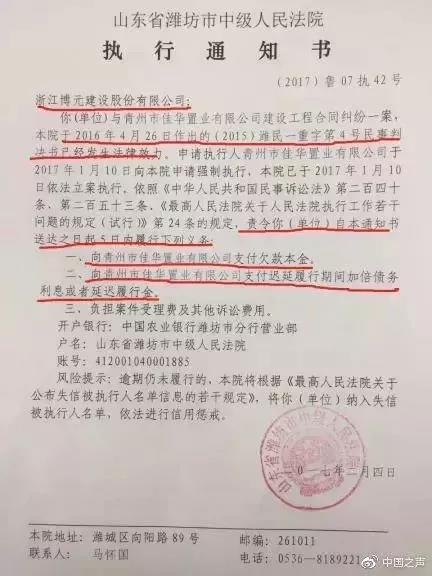 通知书显示,2016年4月26号,由潍坊中院做出的潍民一重字第4号民事判决书已发生法律效力,也就是说浙江博元起诉青州佳华的一审判决生效。蹊跷的是,执行通知书是让浙江博元向青州佳华支付工程欠款本金和利息。