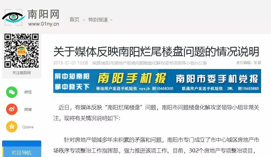 近日,有媒体反映“南阳烂尾楼盘”问题,南阳市问题楼盘化解攻坚领导小组非常关注,现将有关情况说明如下: