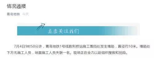 青岛地铁集团4日发布情况通报称,7月4日9时50分许,青岛地铁1号线胜利桥站施工围挡处发生塌陷,直径约10米。塌陷处下方无施工人员,地面施工人员失联一名。