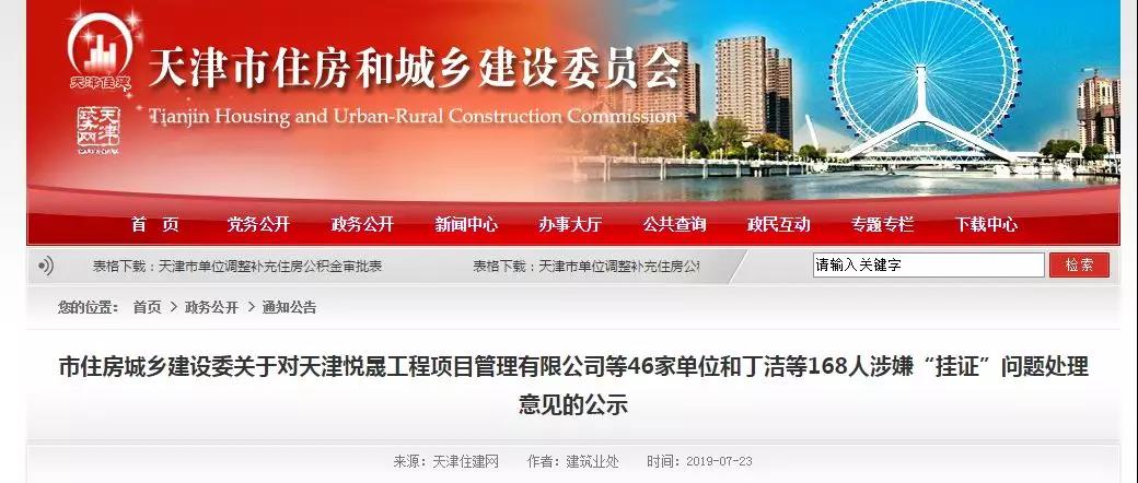 7月23日,天津住建委发布了《关于对天津悦晟工程项目管理有限公司等46家单位和丁洁等168人涉嫌“挂证”问题处理意见的公示》。