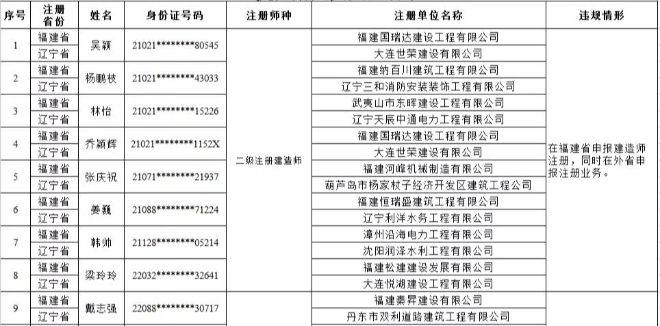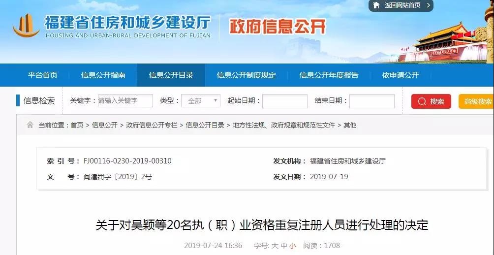 7月24日,福建省住建厅发布了《关于对吴颖等20名执(职)业资格重复注册人员进行处理的决定》。