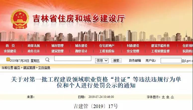 7月24日,吉林省住建厅发布《关于对第一批工程建设领域职业资格“挂证”等违法违规行为单位和个人进行处罚公示的通知》。