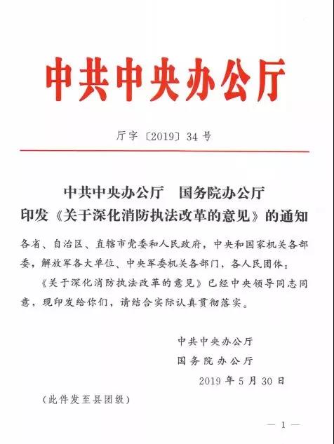 2019年3月19日,中央全面深化改革委员会第七次会议,审议通过了《关于深化消防执法改革的意见》。近日,中共中央办公厅、国务院办公厅正式印发。