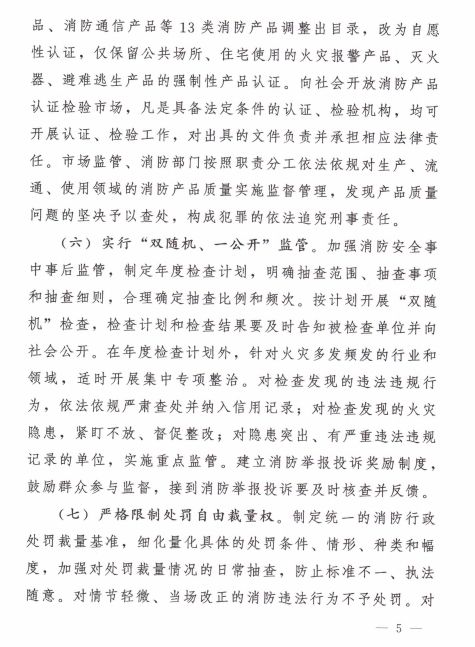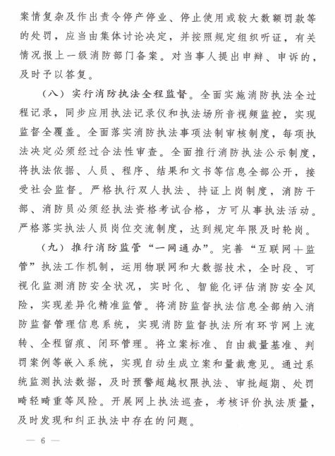 《关于深化消防执法改革的意见》坚持放管并重、宽进严管,强化事中事后监管,建立了以“双随机、一公开”监管为基本手段、重点监管为补充、信用监管为基础、“互联网+监管”为支撑、火灾事故责任调查处理为保障的消防监督管理体系。这5种监管方式各有侧重,相辅相成,是不可分割的有机整体。