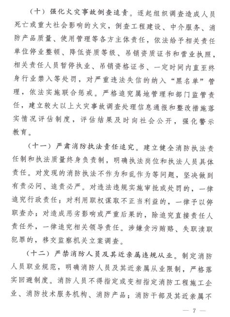 五是严格火灾事故倒查追责,逐起组织调查造成人员死亡或造成重大社会影响的火灾,倒查工程建设、中介服务、消防产品质量、使用管理等各方主体责任,以及部门监管责任,依法依规严肃追究责任。谢谢。