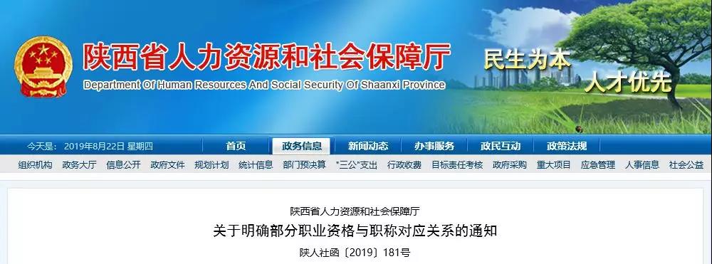 2019年4月,陕西人社厅发布《关于明确部分职业资格与职称对应关系的通知》,明确47项职业资格与职称对应关系。