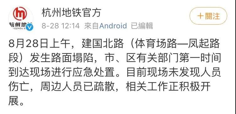 2019年8月28日中午11时许,杭州建国北路和体育场路交叉路口路面出现塌陷事故。初步查明,系地铁5号线联络通道施工发生渗漏水,导致该路段路面坍塌,伴随部分燃气泄漏。