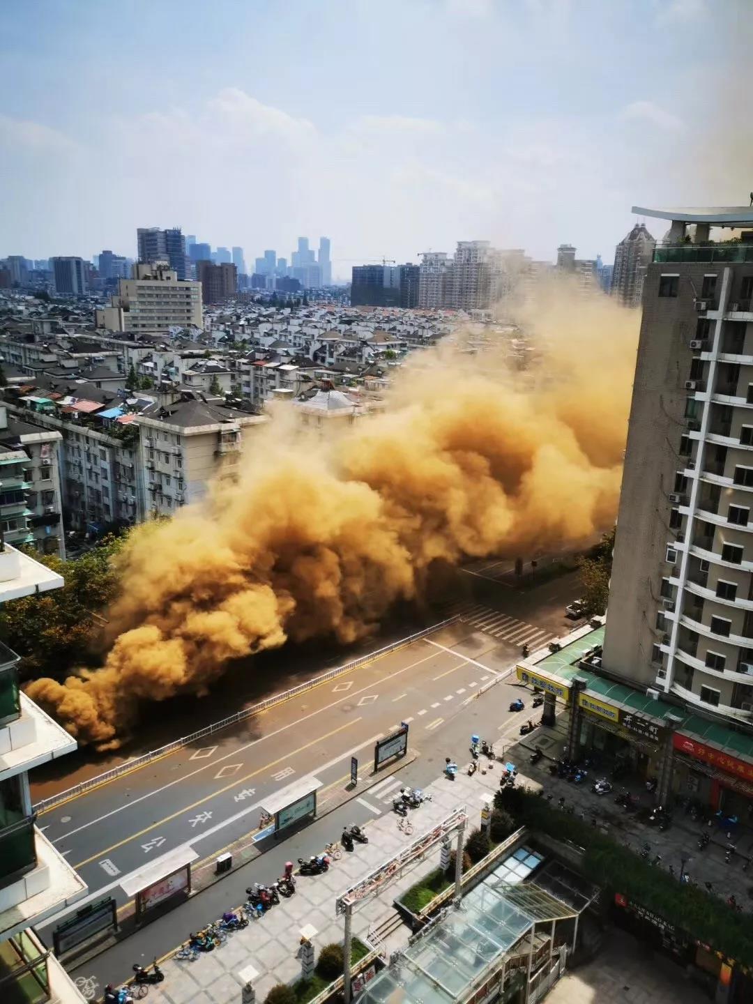 路面塌陷后,冒出黄色浓烟。随后杭州地铁官方微博也发布消息,称目前现场未发现人员伤亡,周边人员已疏散,相关工作正积极展开。