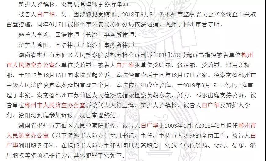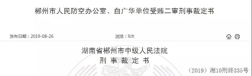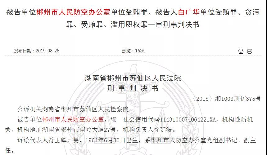 白广华所在的郴州市人民防空办公室,也被法院一审判决犯单位受贿罪,判处罚金90万元,追缴其单位受贿所得赃款1190余万元,予以没收,上缴国库。