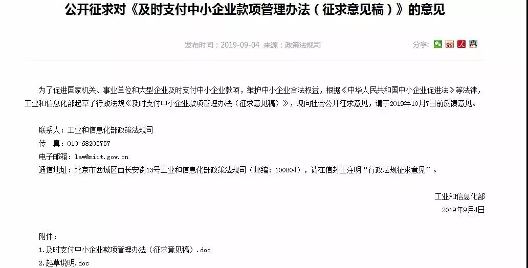 9月4日,工信部发布《及时支付中小企业款项管理办法(征求意见稿)》,对国家机关、事业单位和大型企业支付中小企业款项的相关问题进行明确。