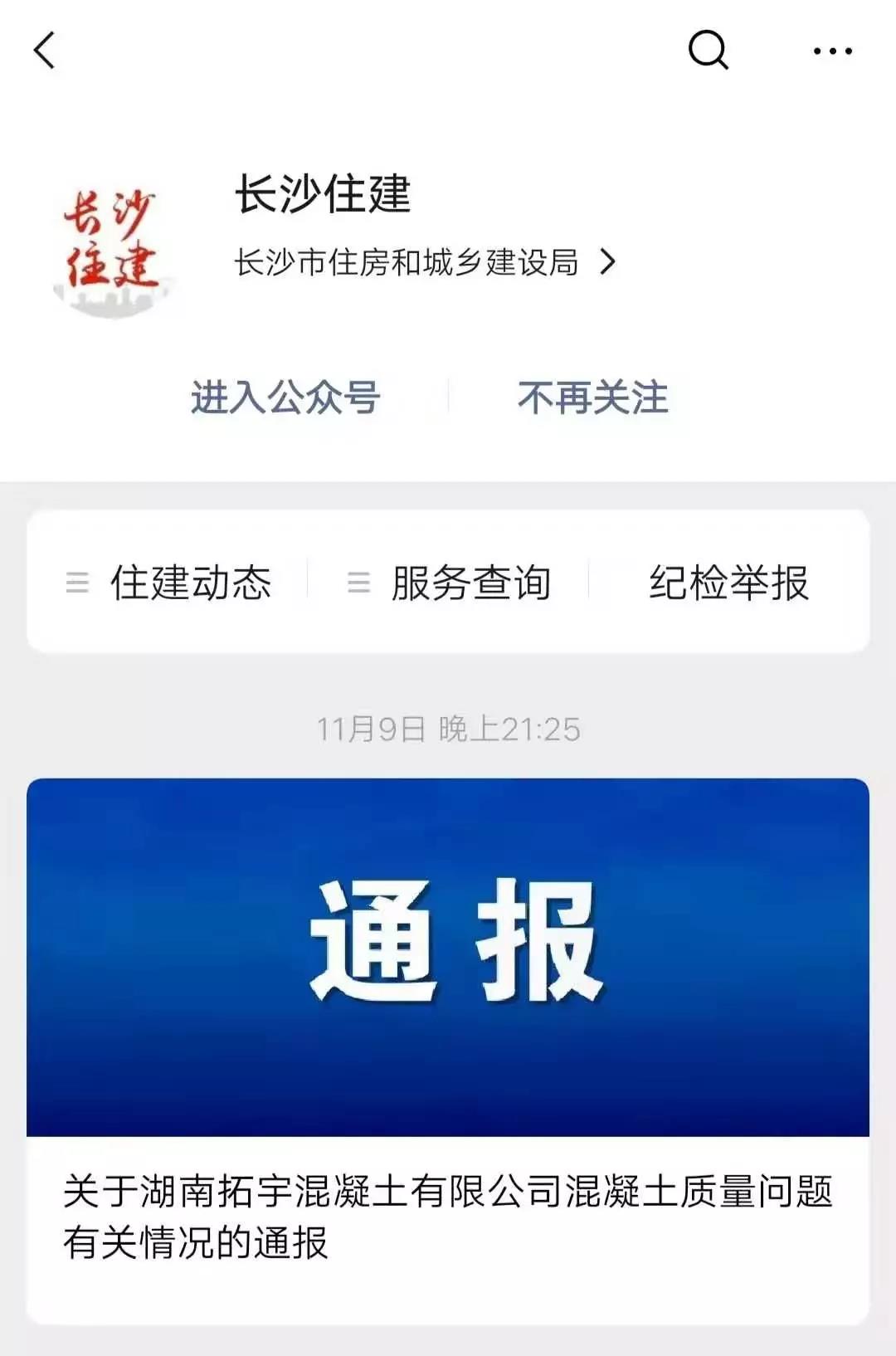 11月9日,公众号“长沙住建”针对混凝土质量问题发布通报。
