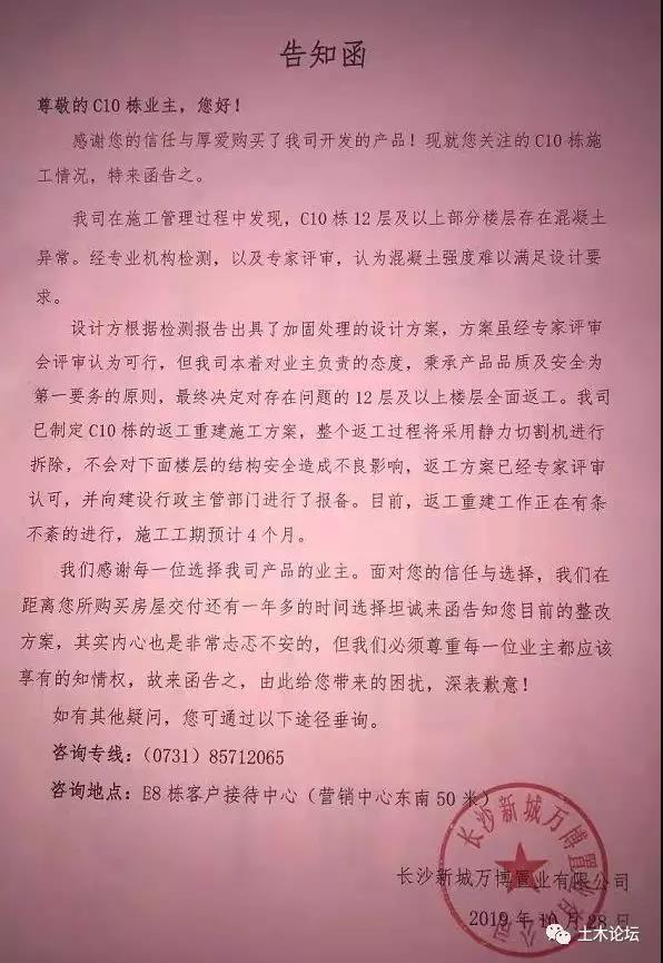 望城区住建局根据检测报告、鉴定报告和专家评审意见,于今年10月份要求参建单位对C10栋12-27层进行返工重建。目前,该项目C10栋正严格按照专家评审的拆除方案进行拆除,其混凝土供应商湖南拓宇混凝土有限公司已全面关停