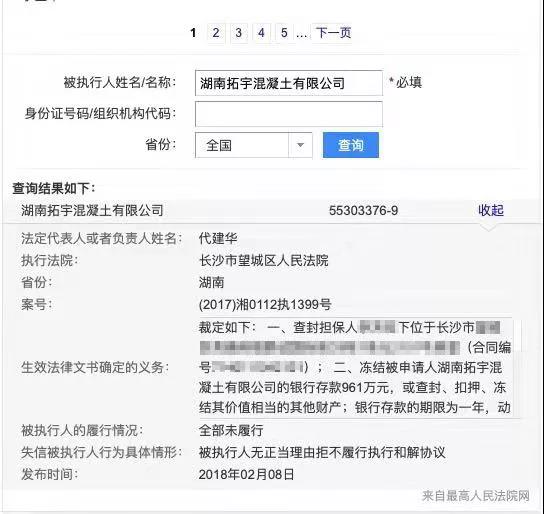 天眼查信息显示,提供问题混凝土的湖南拓宇混凝土公司,在2018年2月因无法履行961万元的法律文书义务,而被法院列入失信被执行人的“黑名单”。