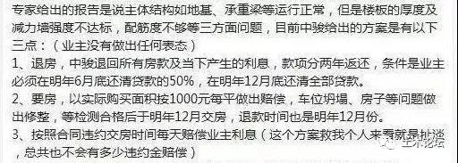 鉴定报告的公示随之引发退房潮,随后中骏方也向购房业主给出了三种解决方案,包括退房、补偿1000元/㎡,以及按违约交房时间赔偿业主利息。