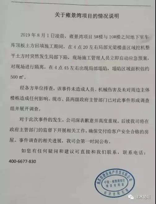 通报显示,8月1日凌晨,中骏雍景湾项目施工单位实施5#楼与10#楼(Y-R轴)之间地下室车库顶板土方回填,约4时20分挖机整平土方时,现场施工管理人员发现V-Q轴/9-20轴无梁楼盖区域突然发生局部下陷,情况发生后立即启动应急预案,工程停工、疏散施工人员、封闭现场等措施,约4时45分该区域出现局部塌陷,塌陷区域面积约500平方米,事故未造成人员伤亡。