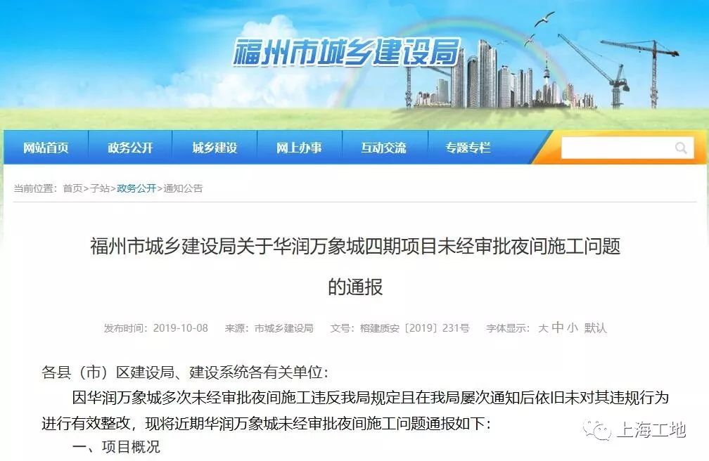 通报称,鉴于华润万象城四期项目中4家噪音防治责任单位,在未经审批的情况下进行夜间施工,项目现场文明施工措施落实不到位,噪声污染问题整改不力, 福州市城乡建设局决定对华润万象城四期项目以及其4家相关责任主体予以全市通报批评。