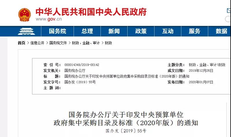 1月7日,国务院办公厅印发《中央预算单位政府集中采购目录及标准(2020年版)》,自2020年1月1日起实施。2016年12月21日印发的《中央预算单位2017-2018年政府集中采购目录及标准》同时废止。