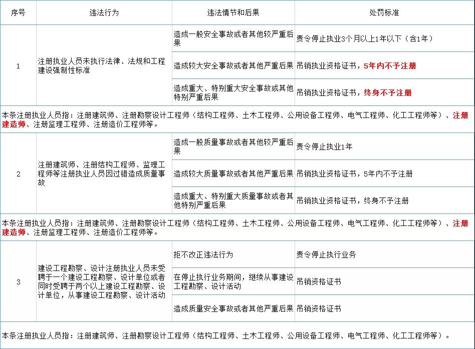 今年9月,住建部发布《住房和城乡建设部工程建设行政处罚裁量基准》,对注册执业人员违法违规造成事故的,根据情节及后果予以处罚,最严重的将吊销证书,终身不予注册!具体如下: