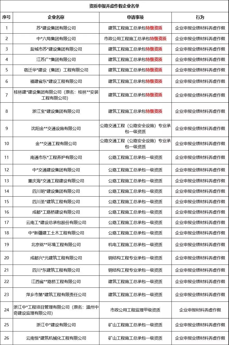 经查,*华建设集团有限公司等26家建设工程企业在资质申报过程中存在弄虚作假行为;富*建设集团有限公司等8家企业在采用告知承诺制方式申报资质过程中存在弄虚作假行为。根据《中华人民共和国建筑法》《中华人民共和国行政许可法》及《建设工程企业资质申报弄虚作假行为处理办法》(建市〔2011〕200号)等规定,决定对*华建设集团有限公司等34家建设工程企业予以通报批评,不批准其资质申请,并将其不良行为在全国建筑市场监管公共服务平台予以公布。自本通报印发之日起1年内不受理上述企业申请相应行政许可。