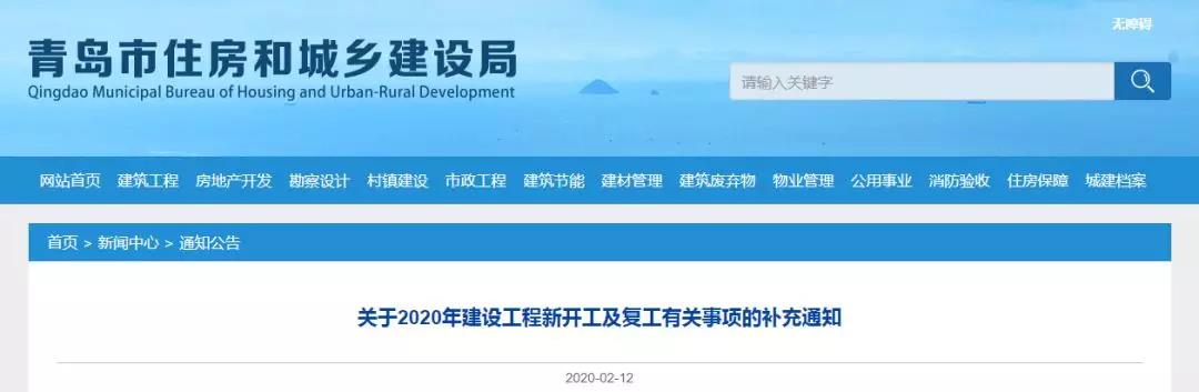 青岛市住建局发布《关于2020年建设工程新开工及复工有关事项的补充通知》,明确: