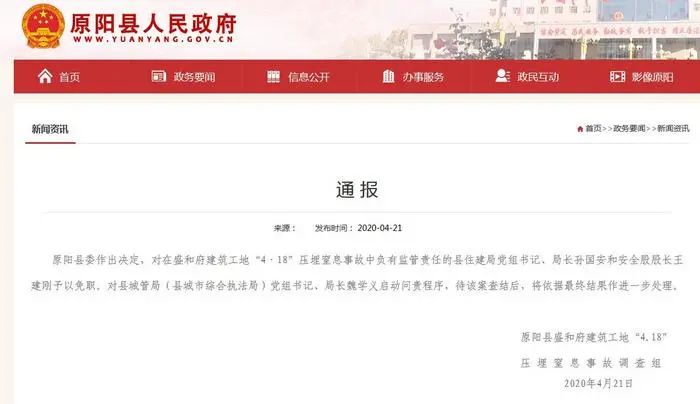 4月21日,原阳县盛和府建筑工地“4.18”压埋窒息事故调查组通报,原阳县委作出决定,对在盛和府建筑工地“4·18”压埋窒息事故中负有监管责任的县住建局党组书记、局长孙国安和安全股股长王建刚予以免职。对县城管局(县城市综合执法局)党组书记、局长魏学义启动问责程序,待该案查结后,将依据最终结果作进一步处理。