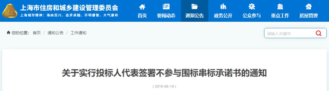 2019年6月,上海市住建委发布了《关于实行投标人代表签署不参与围标串标承诺书的通知》和《关于进一步加强本市建设工程招标投标监管治理打击违法行为的通知》。