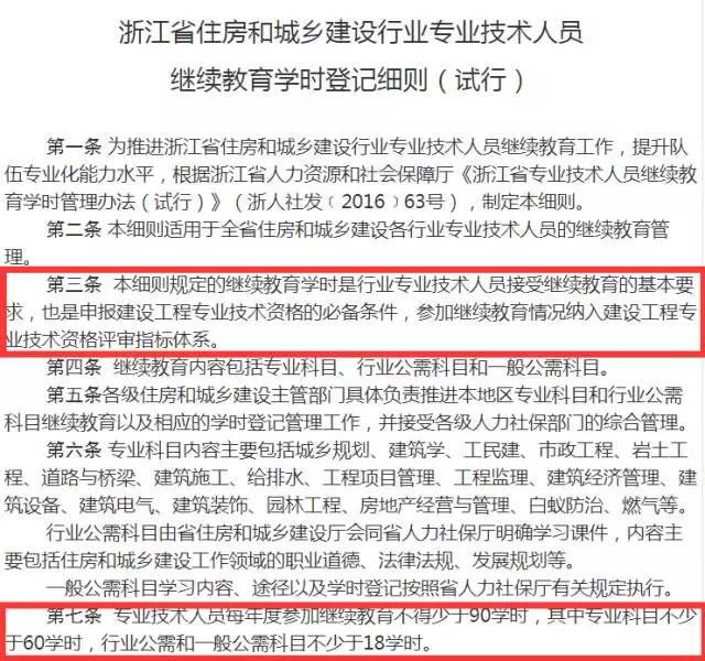 浙江省专技人员继续教育已作为职称评审必备条件,每年继续教育须满90学时,其中,公需科目不少于18学时、专业科目不少于60学时,否则无法参加职称评审,详情请关注《浙江省专业技术人员继续教育学时管理办法(试行)》(浙人社发〔2016〕63号),常见疑问请查阅浙江继续教育网相关内容。